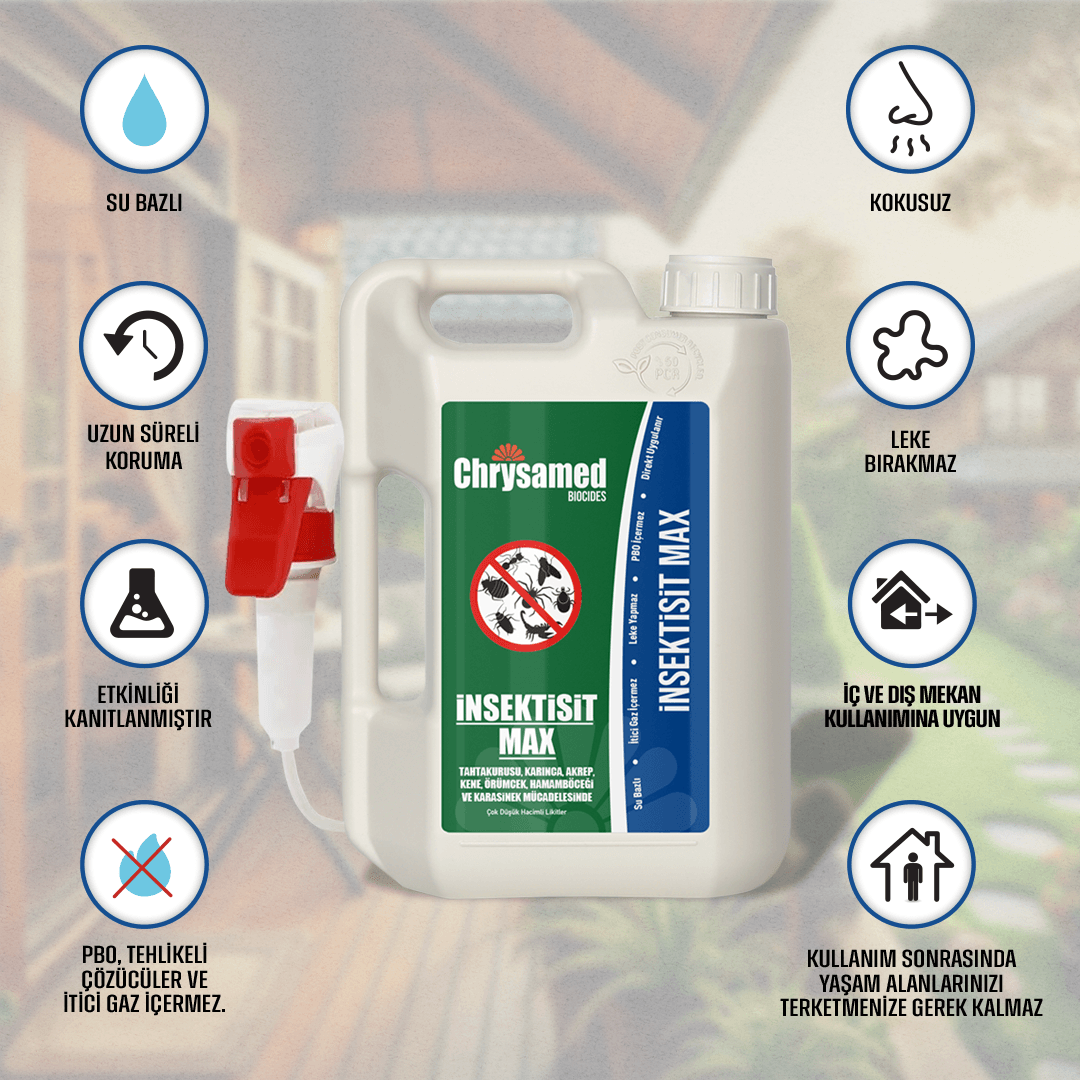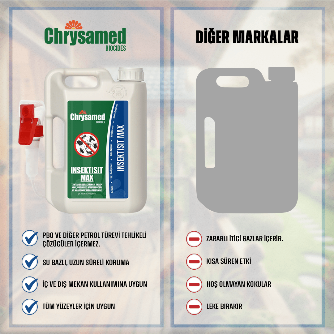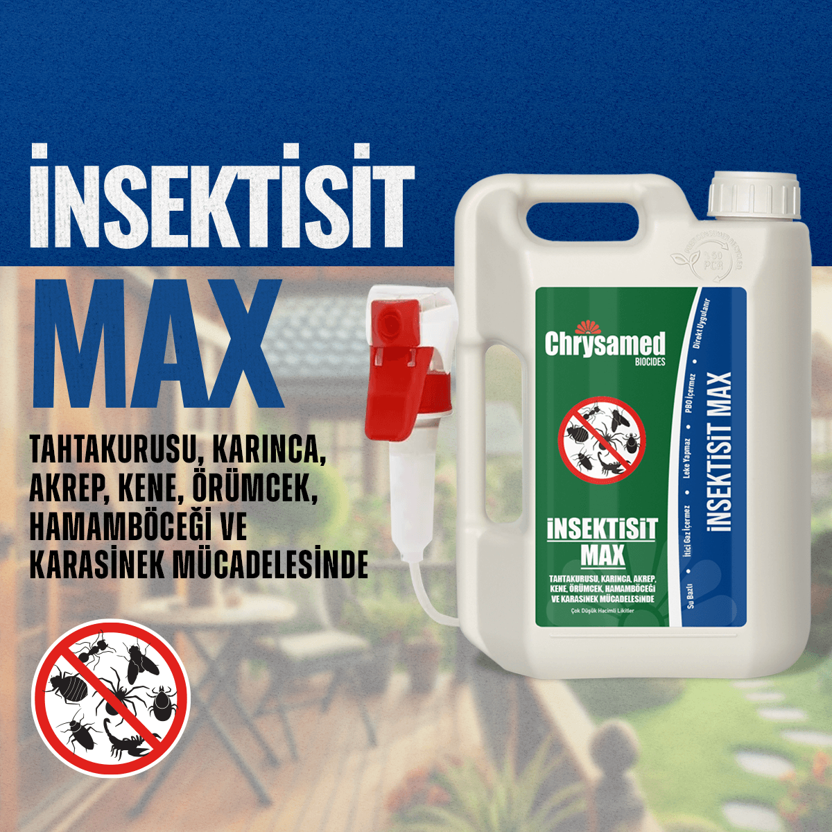 Chrysamed Insektisit Max;  karasinek, hamam böceği, karınca,  tahtakurusu, örümcek, kene, akrep gibi trake sistemi ile solunum yapan böceklere karşı öldürme ve uzaklaştırma (repellent) etkisine sahip genel böcek bir ilacıdır. Etkisi kalıcıdır. Bulunduğu ortamda 3 aya kadar uzaklaştırıcı etki sağlar. İç mekan ve dış mekan kullanımına uygundur.